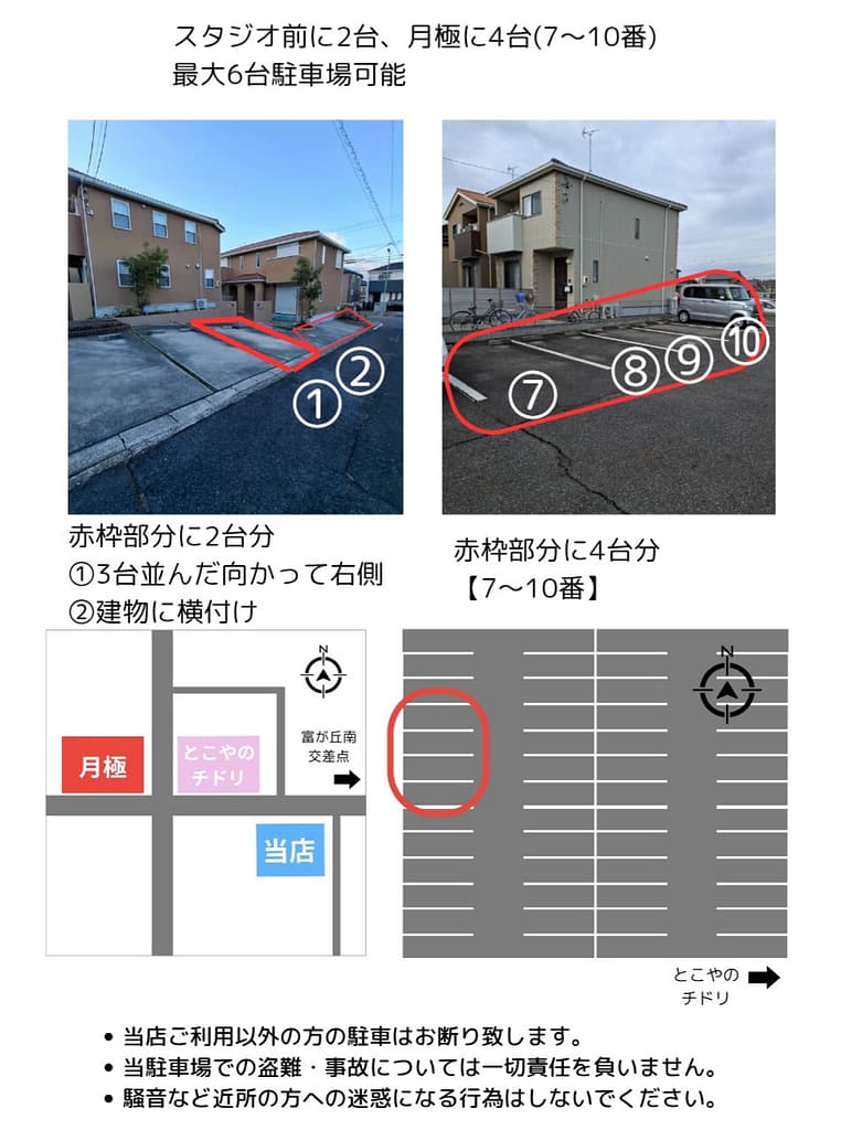 スタジオすぐ前に2台分、1ブロック先の月極に4台、合計最大6台駐車可能です。